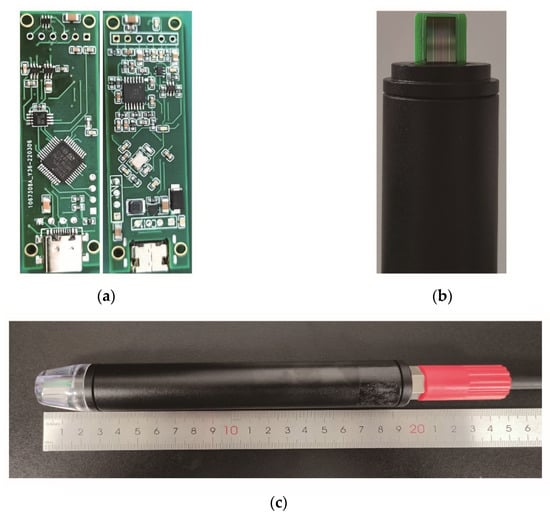 As shown in Figure 4b, epoxy resin is used here to encapsulate the chip adhered to the PCB, which can effectively prevent the exposed pads on the chip from corroding. Furthermore, the size of acquisition circuit board is designed to be 57.5 mm × 18 mm × 1.5 mm, as shown in Figure 4a. The protective cover made of acrylic material can prevent the probe from crashing, and the segmented package design allows a quick replacement of the probe. Moreover, the acquisition circuit board is installed inside the tube shell, and the assembled conductivity sensor is shown in Figure 4c. This package design can transmit data in real-time through cables or realize self-capacitive data storage through TF cards.