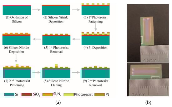 Figure 5. (a) The fabrication process of the conductivity sensor chip; (b) sixty-one chips, each with a size of 17 mm × 7.5 mm × 0.5 mm, can be fabricated on a 4-inch silicon wafer.