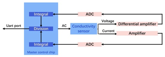 The design scheme for the processing circuit of conductivity sensor is shown in Figure 6. According to the measurement principle of four-electrode conductivity sensor, the master control chip generates and supplies a triangular wave AC signal to current electrode of the conductivity sensor. Meanwhile, a differential operational amplifier measures the voltage difference between the voltage electrodes with high input impedance. Next, the differential amplified output voltage is input to the master control chip for the integral operation through ADC collection. In addition, the current flowing through the other current electrode is input to the operational amplifier after being collected by the ADC, and also input to the master control chip for integral operation. In the master chip, the ratio of current and voltage obtained from the integration process is output through the serial port, and the output value is the original signal of the conductivity sensor.