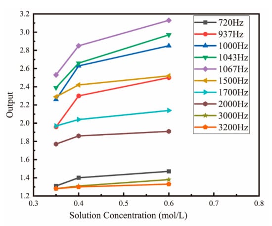 Figure 7. The relationship between concentration and the circuit output at different frequencies. From 720 Hz to 3200 Hz, the frequency is adjusted by dichotomy to determine the optimal excitation frequency.