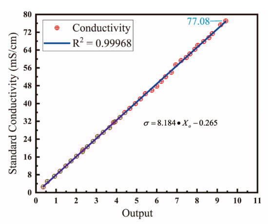 The output of conductivity sensor is the ratio of current and voltage after the integral and mean value processing, thus the conductivity sensor needs to be calibrated. During the laboratory tests, the sensor was preliminarily calibrated to take into account the influence of experimental environment. Different standard conductivity solutions were prepared with dried potassium chloride and deionized water, and the sensor’s output in these solutions was tested at 25 °C. As shown in Figure 8, from 0 to 77.08 ms/cm, the output of conductivity sensor changes linearly with the standard conductivity, and R2 = 0.99968. According to the fitting curve, the relationship between the output XO of conductivity sensor and the standard conductivity σ is: