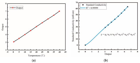 To overcome the impact of experimental environment, a calibration at a third-party organization was carried out, at the National Center of Ocean Standards and Metrology in China. Considering the temperature-dependent characteristics of conductivity of standard seawater, the conductivity sensor was placed in a pool of standard seawater, and data are collected at 5 °C intervals between 0 and 35 °C. The corresponding relationship between the output of the conductivity sensor circuit and the temperature is shown in Figure 9a. According to the calibration protocol, the conductivity of air is considered to be 0 mS/cm. Therefore, the fitted curve between the output of the circuit and the standard conductivity is shown in Figure 9b. The fitted relationship between the conductivity y and the output x of circuit is described in Equation (7).