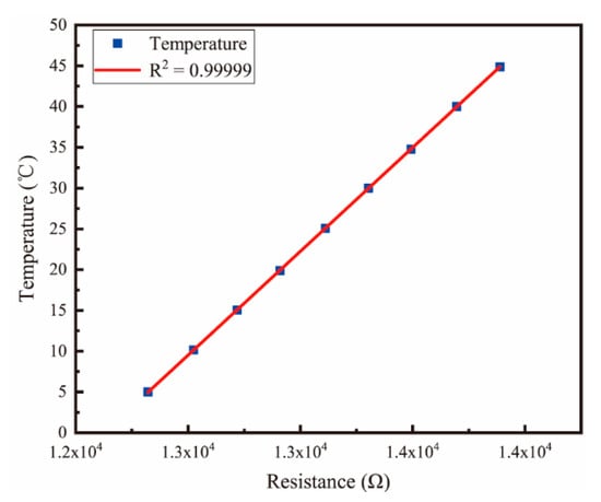 Fundamentally, the resistance of thin-film platinum resistors designed with serpentine structure can reach up to 13 kΩ. Moreover, the resistance of thin-film platinum resistors changes linearly with temperature. According to the eight-point calibration method, the sensor was placed in a constant temperature bath with a temperature fluctuation of ±0.005 °C. Next, eight temperature points were set between 5–45 °C, YOWEXA’s YET-710 temperature sensor was used as the standard instrument, and the relationship between the resistance of thin-film platinum and the actual temperature was measured, as shown in Figure 10. The linear fitting relationship between the resistance of thin-film platinum resistance and the actual temperature is given as: