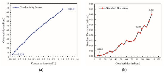 Figure 11. (a) The measurement range of our sensor. The maximum range of our sensor can reach 107.41 mS/cm. (b) The precision of our sensor, and the measurement precision in low and medium range is about ±0.1 mS/cm.