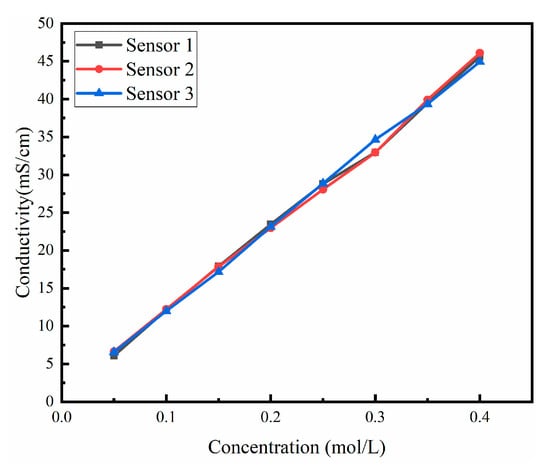 Figure 12. This figure shows the consistent performance of the proposed silicon-based four-electrode conductivity sensor based on platinum film. In different standard conductivity solutions, the test results of the three sensors are basically identical.