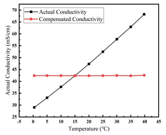 To reduce the effect of temperature on the conductivity test, the conductivity must be temperature compensated. The conductivity of standard seawater was tested from 0 °C to 40 °C. The conductivity values obtained at different temperatures were all converted to conductivity at 15 °C according to Equation (5). Figure 13 shows the actual conductivity of seawater at different temperatures and the conductivity after temperature compensation, with a maximum error of 0.1917 mS/cm after the compensation. Conductivity and temperature can be measured simultaneously by the sensor and displayed directly on the master computer. The temperature, conductivity, and salinity indications can be read out in real time through the master computer, and the sampling time and sampling frequency can also be set through the master computer. When the test was performed in the laboratory, the sensor was fixed about 10 cm below the water surface. Here, the pressure depends on the depth, hence the salinity of the solution, can be calculated directly in the master computer. The developed sensor essentially enables the integrated testing of conductivity, temperature, and salinity.