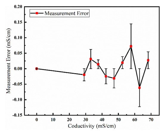 The conductivity of potassium chloride solution with different concentrations was tested using the developed silicon-based thin film conductivity sensor. As evident from Figure 11a, the sensor has a maximum range of 107.41 mS/cm. Each concentration of KCl solution was tested 60 times, and the corresponding standard deviation of the measured conductivity value is shown in Figure 11b. The measurement precision between 0 and 76.422 mS/cm ranges from ±0.005 mS/cm at 5.939 mS/cm to ±0.165 mS/cm at 76.422 mS/cm. Furthermore, the measurement precision between 81.879 mS/cm~107.41 mS/cm ranges from ±0.229 mS/cm to ±0.401 mS/cm.