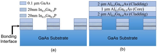 A simple, single-step epitaxial process applies to the majority of the waveguide geometries shown in Figure 1, except for PDI waveguides [30,38] schematically represented in Figure 1h. The epitaxial process, in this case, requires a regrowth. First, two separate GaAs substrates are used in order to grow two AlGaAs heterostructures topped with thin layers of InGaP. The latter are bonded with each other so that their [110] crystal directions are parallel to each other, but the domains are reversed at the bonding interface. After the bonding, one of the GaAs substrates and an AlGaAs sacrificial layer are removed by a wet chemical etching process. Grating patterns are then written on the top layer and chemically etched until the lower GaAs substrate is reached (see Figure 3a). The resulting template exhibits a periodic domain inversion. AlGaAs layers are further grown by MOCVD on top of the template such that they form a heterostructure with a higher-index (lower-Al-concentration) core sandwiched between lower-index AlGaAs claddings [see Figure 3b]. As a final step, a waveguide is defined and etched, maintaining PDI in the propagation direction of light.