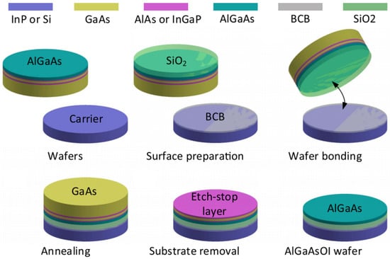The preparation of an AlGaAs-OI wafer involves bonding an AlGaAs wafer to a carrier InP or Si wafer (see Figure 4 for the entire process). First, AlGaAs epitaxial layers are grown on a GaAs substrate; the grown epitaxy contains some AlGaAs sacrificial etch-stop layers with the actual (Al)GaAs guiding layer at the very top. A layer of SiO a few micrometers high is then deposited on top of the (Al)GaAs guiding layer. This SiO layer will be the lower cladding in the ultimate (Al)GaAs-OI platform. The as-grown AlGaAs heterostructure coated with SiO is then flipped and bonded with the SiO side onto a carrier wafer (see Figure 4). This process is followed by sacrificial layers removal through wet chemical etching [8,177]. The prepared AlGaAs-OI wafer is further used for waveguide fabrication, as described in Section 4.1.