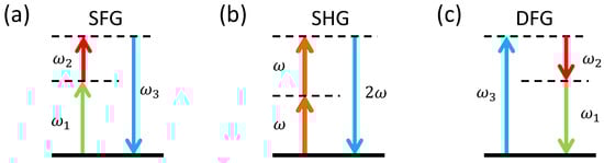 where is the vacuum permittivity. As one can see from Equation (3), the polarization generated by the medium in response to the incident optical field contains the contributions oscillating at the sum frequency of the two incident fields (SFG), their difference frequency (DFG), as well as doubled-frequency components, or SHG, of both the fields. The last contribution represents optical rectification; we do not discuss this phenomenon in the manuscript. The energy diagrams representing the three interactions are shown in Figure 5, where the dashed lines indicate virtual states.