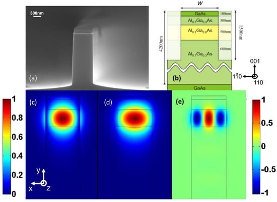 MPM SHG has been realized in AlGaAs nanowires [115], where the fundamental-frequency (FF) TE and TM modes at nm were phase-matched with the second-harmonic (SH) TE mode at nm via a type II PM condition , where refers to the effective refractive index of mode i, and is the speed of light in free space. Figure 6 displays a scanning electron microscopy (SEM) image (part (a)) and the schematic (part (b)) of the nanowires from [115]. Parts (c) and (d) of the figure show the simulated fundamental TE and TM FF modes, and part (e) represents the SH TE mode of the structure. The drawback of this PM technique is associated with the modal shape mismatch between different orders of the interacting modes (see Figure 6c–e), resulting in the loss of efficiency.