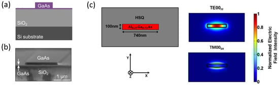 AlGaAs platforms used in nonlinear integrated photonics can be divided into three-layer, two-layer, and multi-layer platforms, depending on the number of epitaxially grown layers with different material compositions (see Figure 1). The three-layer platforms are traditionally in the basis of strip-loaded [13,23,28,31,32,33,34,49,133,134,144], nanowire [9,135,136,137,138,144,149,151], and half-core [144] waveguide geometries (Figure 1a–c, respectively), mostly used for Kerr-type nonlinear devices. Modal-phase-matched SHG in nanowire waveguides has also been demonstrated [115].