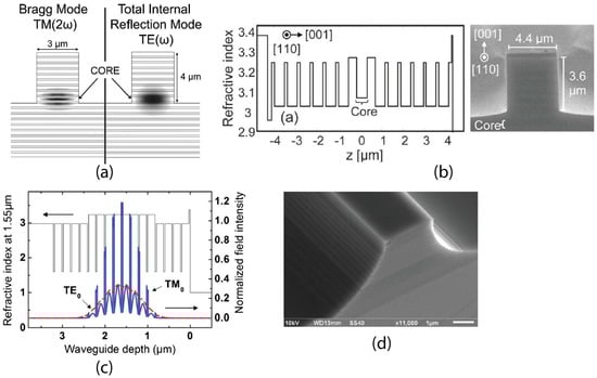 Bragg reflection waveguides (BRW) represent a special type of MPM structure that deserves separate attention. They utilize a structure that can support guided modes via both the total internal reflection (TIR) and transverse Bragg reflection [108,111,114,123,125,193]. The latter is achieved by the periodic structures (Bragg reflectors) defined above and below the guiding layer, see Figure 1i and Figure 8b. Specifically, strong modal dispersion of a photonic bandgap device is exploited to achieve a PM between the fundamental modes guided by different mechanisms and carrying light at different optical frequencies. Typically, a lower-frequency fundamental TIR mode is phase-matched with the higher-frequency fundamental Bragg mode (see Figure 8a,b). In such a way, BRW offer PM between the lowest-order modes of the involved frequencies. This allows for a maximum modal field overlap and optimal pump power utilization.