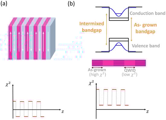 The orientation-patterned structure shown in Figure 1h schematically represents waveguides with periodical domain disordering (PDD) by quantum-well intermixing (QWI) [110,113,126] and periodical domain inversion (PDI) [30,38,45,104,106,112,127]. These techniques are typically implemented in order to achieve a periodic modulation of , either by domain inversion resulting in the sign change of or domain disordering resulting in the periodic suppression of . These approaches lead to quasi-phase-matched (QPM) second-order nonlinear optical interactions.