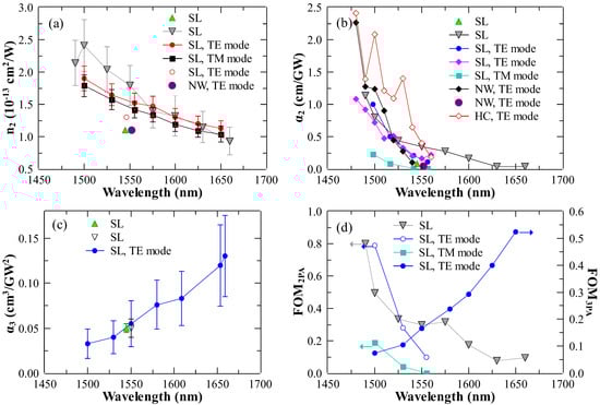 All the materials listed in the table (except for silica glass) exhibit sufficiently high values of . Out of these materials, and GaAs stand out, having the highest values of . GaAs, however, is not suitable for nonlinear optical experiments at 1550 nm due to its relatively high at that wavelength range. In contrast, the particular material composition of AlGaAs is often considered in nonlinear waveguide experiments at 1550 nm because the corresponding bandgap energy is blue-shifted such that is very small. In such a way, represents a great alternative to GaAs binary in the telecom C-band, exhibiting almost as high at the expense of a very small . Some materials such as, e.g., Hydex glass, exhibit negligible 2PA at 1550 nm, not detectable in nonlinear experiments (see, e.g., [82]). However, their values of are 1–2 orders of magnitude smaller than those of AlGaAs and GaAs. Looking at the table, we can conclude that most materials exhibit a negligible or very small 2PA at 1550 nm, except for Si, GaAs, and InGaAsP. Therefore, the latter three compounds are not the best choice for nonlinear photonic devices operating in the telecom C-band.