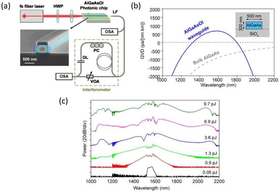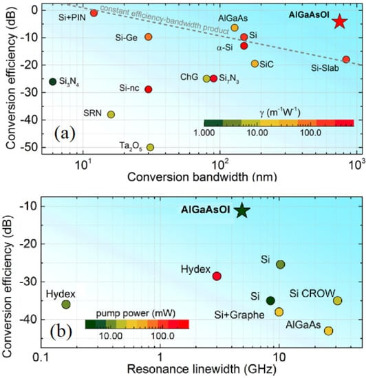 All-optical signal processing operations rely predominantly on all-optical wavelength conversion, which can be implemented using nonlinear optical effects to modify the spectrum of the optical signal. The most significant of these effects for wavelength conversion, four-wave mixing (FWM), entails nonlinear optical interaction of two or more spectral components (light frequencies) within a nonlinear optical medium, which produces a new frequency component as an outcome of this interaction. The FWM-based wavelength conversion offers unprecedented transparency with respect to the signal modulation format [7], which is especially important for modern communication networks relying on complex modulation schemes. Although there are many materials that can be used to produce this nonlinear interaction [2,3,4,5,6], a III–V semiconductor compound aluminum gallium arsenide (AlGaA) has consistently been shown to demonstrate exceptional qualities for all-optical signal processing at the Telecom C-band (frequency range centered around 1550 nm, the fiber optics wavelength). Coupled with the fact that it can produce the strongest nonlinear optical interaction for wavelength conversion [8,9,10,11], it exhibits low linear and nonlinear propagation losses in the Telecom spectral range (1400–1600 nm) [9,12,13], which is highly desirable in a commercial context. Furthermore, AlGaAs exhibits strong electro-optic effect, beneficial for fast optical signal routing, and a large thermo-optic coefficient (two times larger than that of Si), enabling efficient thermal tuning. All these qualities puts AlGaAs in a unique position for practical realization of all-optical functions. This review is focused on the progress and achievements in the field of AlGaAs nonlinear photonics.