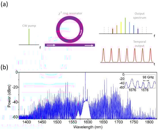 - Kippenberg, T.J.; Gaeta, A.L.; Lipson, M.; Gorodetsky, M.L. Dissipative Kerr solitons in optical microresonators. Science 2018, 361, eaan8083. [Google Scholar] [CrossRef]