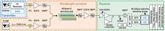 - Apiratikul, P.; Astar, W.; Carter, G.M.; Murphy, T.E. 10-Gb/s Wavelength and Pulse Format Conversion Using Four-Wave Mixing in a GaAs Waveguide. IEEE Photonics Technol. Lett. 2010, 22, 872–874. [Google Scholar] [CrossRef]