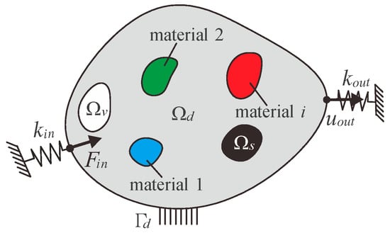 A general problem for the topology optimization of multi-material compliant mechanisms is illustrated in Figure 2. A general linear-elastic body occupying a two-dimensional region and fixed at the boundary Γd is considered. The elastic body can be divided into a prescribed solid domain Ωs, a prescribed void domain Ωv, and a design domain Ωd. The design domain can set i different materials, according to the requirements. The input port is subjected to a given force Fin and an artificial spring kin is attached here which is used to simulate the interaction between the actuator and the compliant mechanism. The output port exhibits the output displacement uout due to input force Fin and an artificial spring kout is also attached here which is used to simulate the interaction between the workpiece and the compliant mechanism.