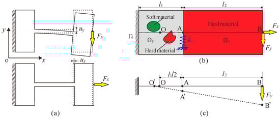 Figure 3b shows the schematic diagram of the topology optimization model of a multi-material flexure hinge, where ΩD is the design domain, including soft and hard materials, and ΩN is the rigid link whose material is only one hard material and is a prescribed non-design domain. Γd is the Dirichlet boundary condition with prescribed displacements, and l1 and l2 are the lengths of the design domain and the non-design domain, respectively. Point O is the geometric center of the design domain; points A and B are the midpoint of the right end of the design domain and the midpoint of the right end of the non-design domain, respectively. In the topology optimization of a multi-material flexure hinge, the left end of the design domain is fixed and then forces Fx and Fy are applied at point B. Simultaneously, an artificial spring ks is added to the y-direction of point A to turn the topology optimization problem into a well-posed design, thereby avoiding the numerical instabilities.