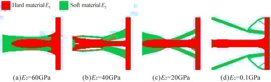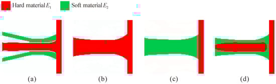 In order to analyze how the configuration of the flexure hinge changes when the Young’s modulus of the two materials is not much different, the Young’s modulus of the hard and soft materials is set to E1 = 71 GPa and E2 = 40 GPa, respectively, and the volume fractions are the same as before. The topology optimization results of the multi-material flexure hinges are shown in Figure 10.