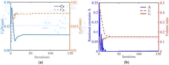 The convergence histories of the objective function for the obtained multi-material flexure hinge described in Figure 4a are shown in Figure 5a. It can be observed that the compliance Cy in the y-direction of the flexure hinge gradually increases and the compliance Cx in the x-direction of the hinge gradually decreases. Figure 5b shows the iterative process of the rotational center constraint Λ and the volume fractions V1 and V2. It can be seen that the Λ finally converges to a value that is very close to 0, and the volume constraints of both materials converge to the given value of 0.15.