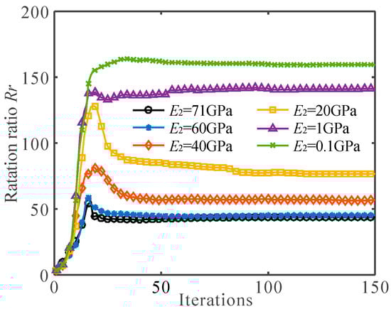 The convergence histories of the rotation ratio Rr for different Young’s modulus combinations (E1 = 71 GPa).