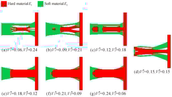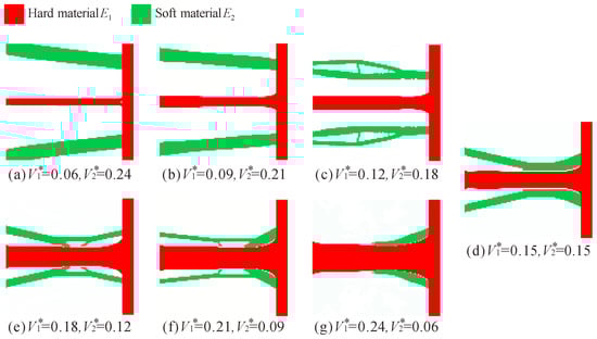 In Figure 9d, the volume of the two materials is equal, and the volume of the hard material in Figure 9a–c is less than that of the soft material. From Figure 9a–c, it can be observed that as the volume of the hard material decreases (the volume of the soft material increases), the soft material gradually moves away from the hard material and tends to be trapezoidal. In Figure 9e–g, the volume of the hard material is more than that of the soft material. As the volume of hard material increases (the volume of soft material decreases), the configuration of the flexure hinge gradually moves towards the leaf-type flexure hinge, and when the volume of the soft material is very small (V1* = 0.24 and V2* = 0.06), its effect can be ignored.