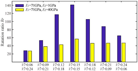 To quantitatively analyze the effect of volume fraction on the performance of multi-material flexure hinges, the rotation ratio of the flexure hinge was calculated and displayed as a bar graph, as shown in Figure 11. It can be found that no matter the degree of difference between the Young’s modulus of the two materials, the rotation ratio of the flexure hinge reaches the maximum value when the volume of the soft and hard materials is the same. When the difference between the volumes of the soft and hard materials becomes increasingly large, the rotation ratio of the multi-material flexure hinge becomes gradually smaller.
