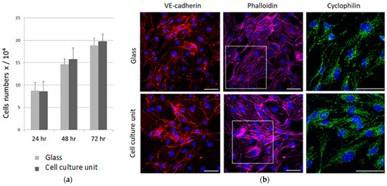 HUVEC were seeded via microfluidic control platform on cell culture unit or on glass coverslips as control. (a) The cells were counted using an automated cell counter. Data are the means ± standard deviation of five independent experiments in duplicate. (b) HUVEC were cultured on cell culture unit and on glass coverslips for 72 h. The cells were fixed and observed by confocal microscopy after phalloidin, Ve-cadherin, cyclophilin F, and DAPI staining. White square is zoomed-in cyclophilin staining image. Scale bar: 50 µm.