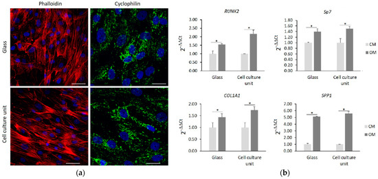 hMSC were cultured on cell culture unit and on glass coverslips. (a) After 72 h, cells were observed by confocal microscopy after phalloidin, cyclophilin F, and DAPI staining. Scale bar: 50 µm. (b) Confluent hMSC were cultured for 24 h in OM. Real-Time PCR was performed on RNA extracted from hMSC using primers designed on RUNX2, Sp7, COL1A1, and SPP1 sequence (* p ≤ 0.05).