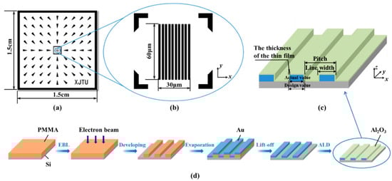 All the experiments were performed in a class 1000 clean room with a constant temperature of (25 ± 1) °C. The patterns of sizes 10–200 μm in the guidance area were fabricated by conventional micro-fabrication processes including ultraviolet lithography and lift-off process []. The specific fabrication and regulation process of the 1D grating structure is demonstrated in Figure 1d. The sample was cleaned sequentially in acetone, isopropanol (IPA) and deionized water. After that, a layer of polymethyl methacrylate (PMMA) photoresist AR-P 679 with a thickness of 100 nm was spin-coated on the substrate at 2000 rpm and baked for 2 min at 150 °C on a hot plate. Then, the one-dimensional grating structure pattern was exposed on the photoresist layer using EBL (CABL-9000C, Crestec, Hamamatsu, Japan). After the EBL process, the sample was developed in a mixture of methyl isobutyl ketone (MIBK) and IPA (1:3) for 1 min at 25 °C. Progressively, 5 nm Cr and 25 nm Au films were evaporated (TF500, Hind High Vacuum, Crawley, United Kingdom) on the sample, followed by the removal of remaining photoresist in dioxolane solution for 10 min at 25 °C. The sample was then cleaned with acetone, IPA and deionized water for 5 min each. Next, the grating structure was measured by AFM (INNOVA, Bruker, Karlsruhe, Germany) and the deviation between the designed dimension of linewidth and the actual fabricated dimension was calculated. Finally, the three-dimensional amorphous Al2O3 thin film was grown on the grating surface by ALD (R-200, Picosun, Masala, Finland). All the specific parameters of the ALD process have been described in our previous works [].