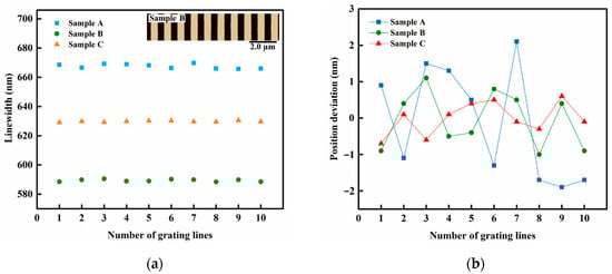 Firstly, in order to evaluate the linewidth uniformity of each grating line, ten grating lines in the standard were selected and their linewidths were calculated and analyzed. A length of L = 2000 nm was intercepted from each grating line, where 20 positions were chosen uniformly from top to bottom. The linewidth at each position of the grating line was the difference between the threshold line calculated by the gravity center method [] and the two intersection points generated by left and right edges of grating line. The results of the linewidth of 10 grating lines for the three samples after ALD are shown in Figure 2a, while the position deviation curves of the linewidths are shown in Figure 2b. The inset in Figure 2a shows the AFM image of sample B after ALD. As evident from the figure, the 1D grating standard possesses well-distributed grating lines and excellent parallelism. However, there are a few particles or defects introduced by the tensile stress on Au with high ductility, during the lift-off process. It is shown in Figure 2a that the linewidths of the ten grating lines of each sample are close to each other with a slight degree of fluctuation. The deviation between the linewidths of 10 grating lines of sample A is the largest, but the maximum deviation is still only 2.1 nm (Figure 2b), which accounts for only 0.3% of the linewidth, thereby indicating the uniformity of linewidths of multiple grating lines in this structure. Hence, the user can select any grating line for the linewidth calibration, which certainly improves the repeatability of the calibration results.