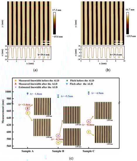 The average value of the linewidths of 10 grating lines was taken as the linewidth calibration value of each sample. The AFM images and comparison of the linewidths of the three samples before and after ALD are shown in Figure 3. It is shown in Figure 3a,b that the height of the grating was not changed and only the grating lines were widened since ALD was growing the film simultaneously in the 3D direction. Here, the actual increase in the linewidths of three samples was 13.4, 19.6, and 29.7 nm, respectively. Evidently, the actual increase in the linewidths of samples B and C was close to the estimated value, while the actual increase in the linewidth of sample A deviated from the expected increment by 3.4 nm. This is because the linewidth uniformity of sample A is worse than the other two samples, as shown in Figure 2b. Further, the line edge roughness (LER) of the three samples was calculated according to Equation (1) [] as LERA = 18.9 nm, LERB = 16.4 nm, and LERC = 15.9 nm, respectively. Thus, the final evaluation results are likely to be disturbed by many parameters such as the selection of linewidth evaluation position, quality of grating line edge, and linewidth evaluation algorithm when measuring and calculating the linewidth of this standard.