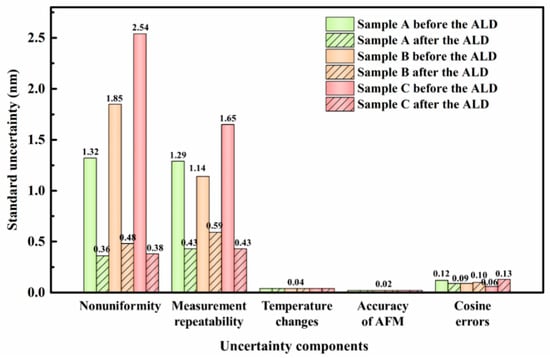 The standard uncertainty of major uncertainty components of samples A, B, and C, before and after ALD.
