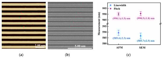 On the basis of measurement results, the sample satisfies a cross-comparison of the measurement capabilities of two measurement instruments. Excellent 3D morphology measurements were realized in the AFM, and clear edges of grating lines along with a sharp contrast with the substrate were demonstrated in the SEM. In conclusion, it can be assessed that the consistency level of results obtained by both instruments is superior in this work, based on the En. Accordingly, this experiment demonstrates that the samples obtained via precise linewidth regulation based on ALD can be applied to many different types of measurement instruments, where simultaneous calibration of nanoscale pitch and linewidth can be achieved, thereby enhancing calibration efficiency substantially.