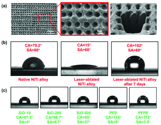 - Cheng, Y.; Yang, Q.; Lu, Y.; Yong, J.; Fang, Y.; Hou, X.; Chen, F. A Femtosecond Bessel Laser for Preparing a Nontoxic Slippery Liquid-Infused Porous Surface (SLIPS) for Improving the Hemocompatibility of NiTi Alloys. Biomater. Sci. 2020, 8, 6505–6514. [Google Scholar] [CrossRef]