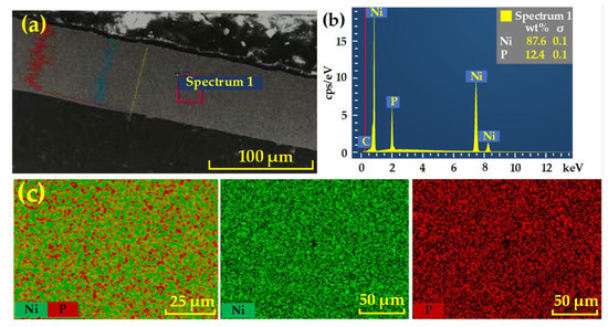 Test results of the experimental sample. (a) Cross-sectional morphology of the NiP coating, (b) Elemental analysis result, and (c) EDS mapping.