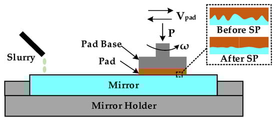 Chemical mechanical polishing (CMP) is a surface treatment method that uses the joint action of chemical corrosion and abrasive removal [24,25]. It is one of the key processes to achieving the performance goals of modern microprocessors and memory chips [26]. However, the chemical mechanical polishing technology used in semiconductor processing is a global planarization technology, which cannot realize the processing of large aperture and nonplanar mirrors. The smoothing polishing is based on the principle of chemical mechanical polishing, and the size of the polishing disc used in polishing is 1/4 to 1/16 of the size of the optical element [27]. Smoothing polishing also has a unique combination of chemical and mechanical action and is an effective way to remove turning marks.