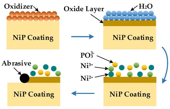 The chemical reaction process is shown in Figure 3 [31]. With hydrogen peroxide (H2O2) as an oxidant, the NiP coating generates a thin oxide film on the surface under the action of the oxidant. The reaction equation is Equations (1)–(3).
