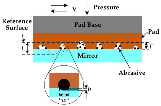 Under the stable polishing state, the force balance state is reached among the abrasive particles, workpiece, and polishing pad, and h can be calculated by equating Equation (7) = Equation (8).