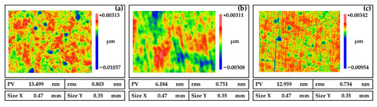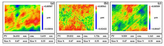 Abrasives play a role in material removal in polishing, so selecting the appropriate type of abrasives is very important. In chemical mechanical polishing, the wide application abrasives are CeO2, SiO2, and Al2O3. As shown in Figure 5a (measured by white light interferometer (Zygo NewView 700) under a 20× lens with a scan size of 0.47 mm × 0.35 mm), the material removal rate of the NiP coating is low due to the low hardness of CeO2, which affects the processing efficiency. As shown in Figure 5b, the hardness of the NiP coating is less than that of Al2O3, and scratches are easily generated during polishing, which affects the surface quality. SiO2 has moderate hardness and could maintain long-term stability in the polishing slurry without agglomeration. As shown in Figure 5c, polishing NiP coatings with SiO2 enables good surface quality. Therefore, SiO2 is selected as the polishing abrasive.