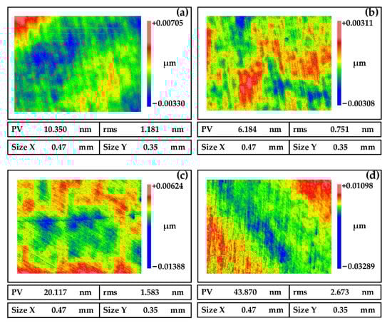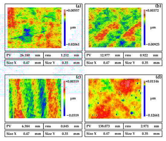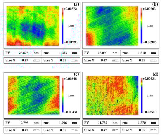 Polished surfaces of NiP coating induced by different pressures (a) 0 MPa, (b) 0.01 MPa, (c) 0.02 MPa, and (d) 0.03 MPa.