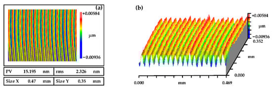 The surface morphology of the NiP coating through SPDT is shown in Figure 10. It was measured by a white light interferometer (Zygo NewView 700) under a 20× lens, the scanning size was 0.47 mm × 0.35 mm, and the surface roughness was RMS 2.326 nm. From Figure 10, we can see that the surface presents an obvious periodic structure, which would enhance the surface scattering effect, increase the loss of light flux, cause dispersion in the optical system and deteriorate the visual performance of the component. Therefore, subsequent processing must be carried out to improve the surface quality from SPDT.
