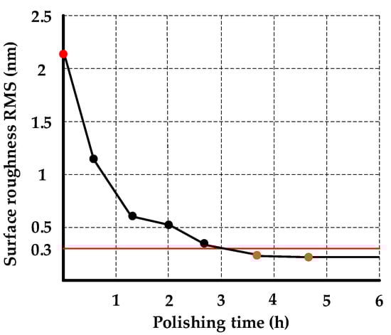 Figure 15 shows the change process of the surface roughness of the NiP coating during smoothing polishing. After 4.5 h of smoothing polishing, the surface roughness of the layer reached RMS 0.223 nm. This paper’s polishing slurry and processing technology can obtain the surface roughness below RMS 0.3 nm when processing the NiP coating.