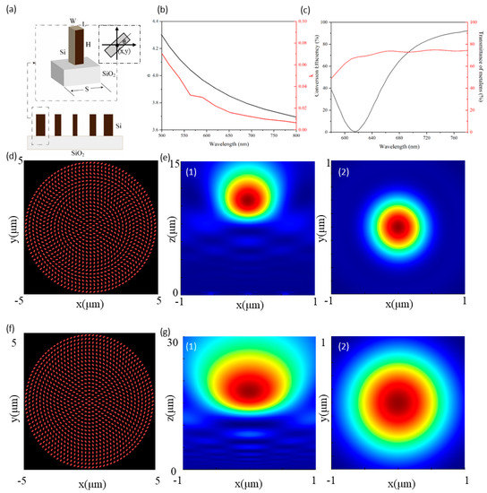 All the simulations were performed by using the commercial finite-difference time-domain (FDTD) method implemented by commercial software ‘Lumerical FDTD Solutions’ (produced by Ansys Inc., Vancouver, BC, Canada) [32] to optimize the parameters of the unit cell so that it has a high polarization conversion efficiency in the working wavelength range and can converge an increased number of light beams to achieve a higher focusing efficiency. The optimized unit cell parameters are: period S = 275 nm, length L = 75 nm, and the width of the unit cell is W = 95 nm. The polarization conversion efficiency of the unit cell reaches 92%, as shown by the black curve in Figure 1c. Although the polarization conversion efficiency of the unit cell varies widely, the transmittance of the overall metalens array always remains above 50%, as shown by the red curve in Figure 1c. This is because the coupling effect between the unit cells still exists, which can allow the unit array to exhibit high transmittance, even when the corresponding polarization conversion efficiency is very low. Figure 1d,f depicts the schematic of the metalens.