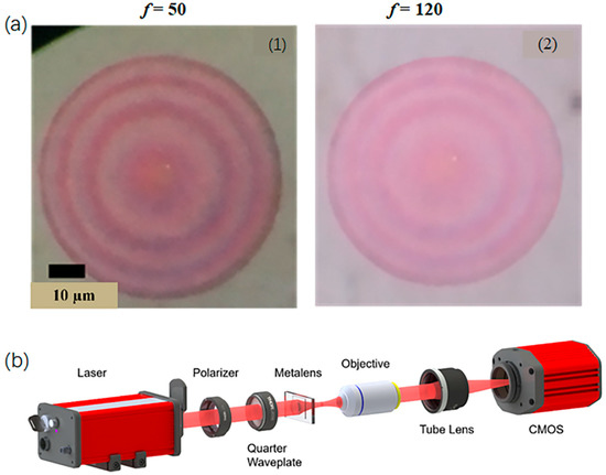 (a) Images of the fabricated metalens under the optical microscope (1) f = 50 µm and NA = 0.447 (2) f = 120 µm and NA = 0.204; (b) schematic for the optical setup used for characterizing the focusing characteristics of the designed metalens.