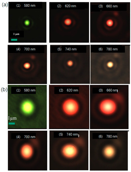 When the laser beam is strictly coaxial, first place the 100× high numerical aperture objective lens on the motorized linear stage close to the side of the metalens, so that the high numerical aperture objective lens can clearly image the metalens structure on the substrate and record the position of L1. When the position of the motorized linear stage is L1, move the stage in order to move the high numerical aperture objective lens away from the metalens. When the light passing through the high numerical aperture objective lens forms a circular spot with the minimum size and the strongest intensity on the CMOS, the position L2 of the motorized linear stage is recorded and the calculation of L2-L1 is the focal length f of the metalens. Then, change the wavelength of the incident light and repeat the above steps to obtain the focal length of the metalens at different wavelengths. The focal spot of the metalens under different numerical apertures is shown in Figure 3.