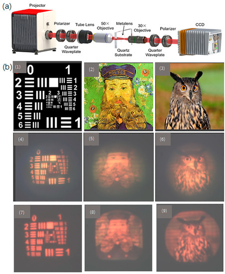 (a) The optical setup for characterizing the imaging performance of the designed metalens; (b) imaging performance of the metalens. (1)–(3) are the source images, (4)–(6) are the images produced by the designed metalens with NA = 0.447, while (7)–(9) are the images produced by the designed metalens with NA = 0.204. (1) 1951 USAF Resolution Target; (2) Vincent Van Gogh’s Portrait of the Postman Joseph Rulan; (3) gran búho, pájaro photo by Ton W, an animal image from pixnio.com (accessed on 24 June 2022) in November 2018.