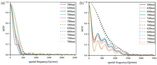 The MTF curve of the focal point on the focal plane of the metalens with normal incident NA of (a) 0.204 and (b) 0.447 at different incident wavelengths. Dashed lines are simulated MTF, while solid lines are extracted from the experimental results of Figure 3.